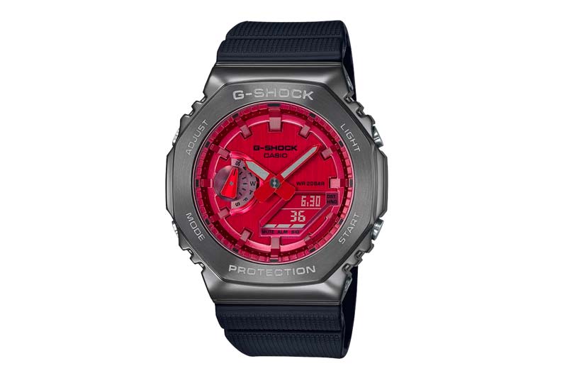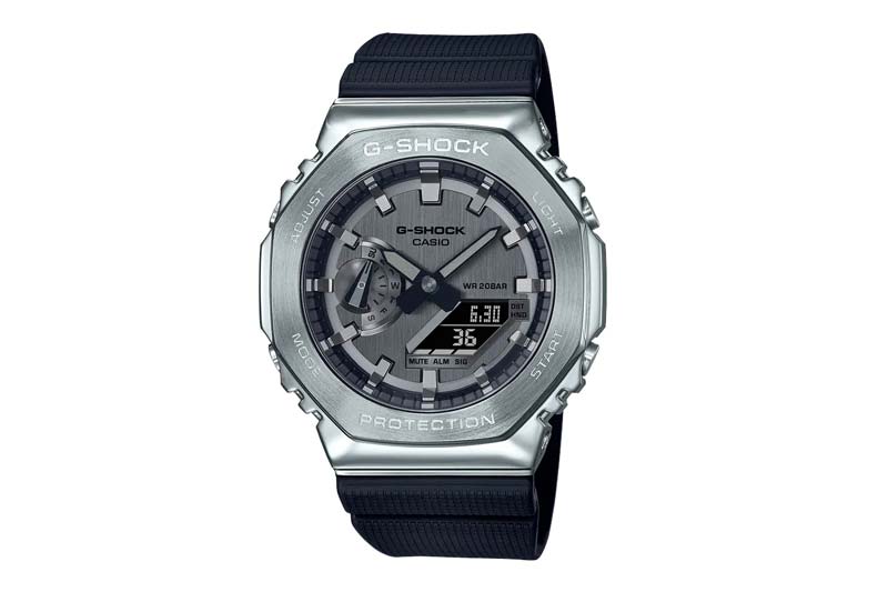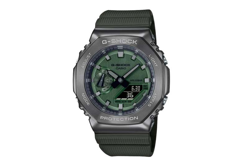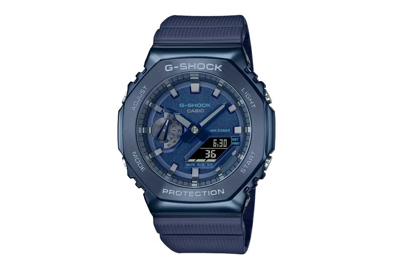 The CasiOak GM-2100 series presents a 44mm sized case (49.3mm lug-to-lug) and maintains the watch’s signature analog and digital readings in this metal version.