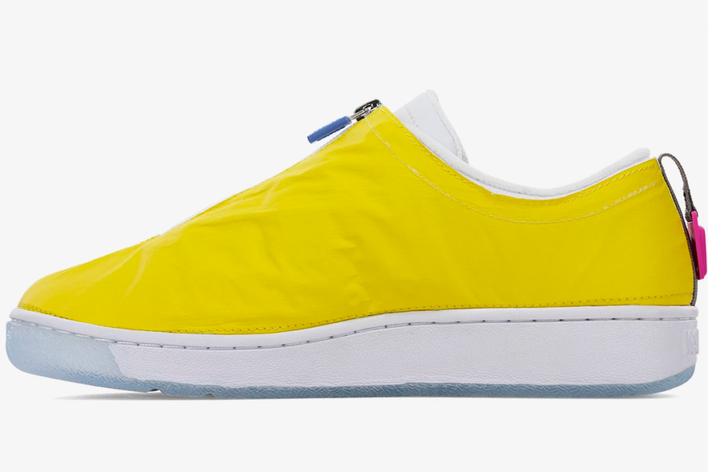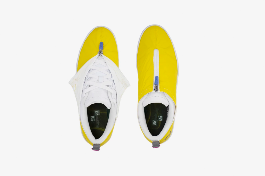 A yellow ripstop shrouds cover the white upper of each shoe, as this exterior is equipped with a zipper running down the forefoot and a heel buckle. Breaking Bad graphics brand the shoes at the heel.