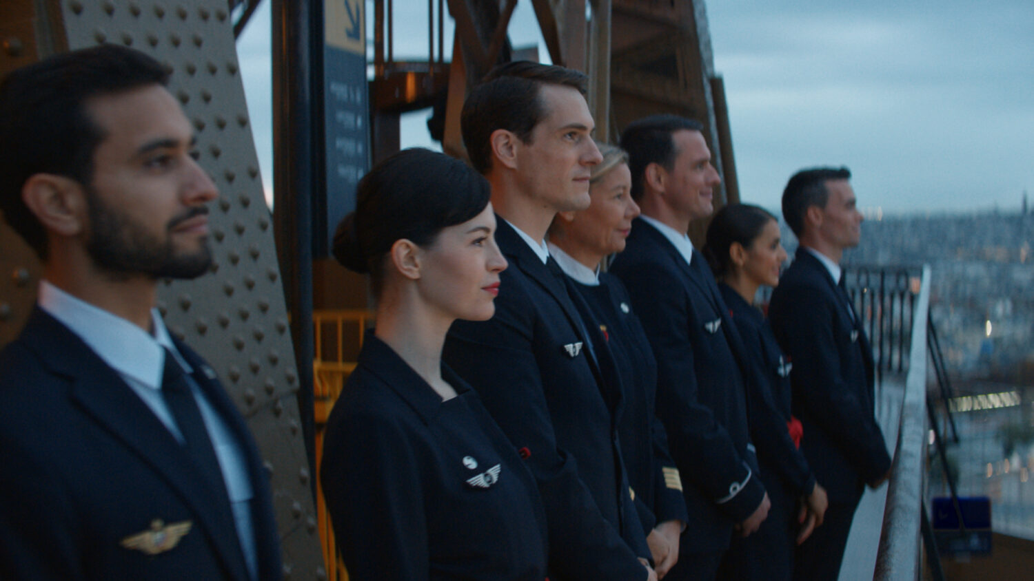 The safety briefing ends at the top of the sparkling Eiffel Tower, where an Air France crew greets the airline’s customers.