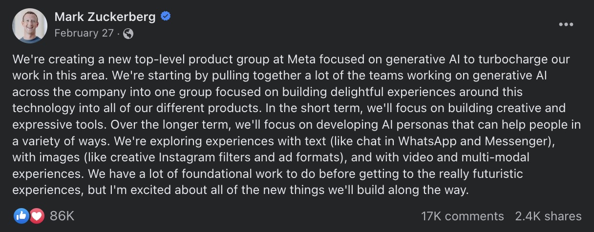 Back in January, Meta CEO Mark Zuckerberg announced the creation of a new “top-level product group” focusing on generative AI and its role in creating a slew of features in the short and long term.