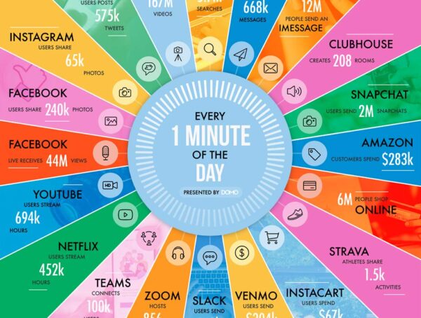 Did you know? Each minute, 208 rooms are created on Clubhouse, 240K photos are uploaded on Facebook, and Amazon shoppers spend $283k!