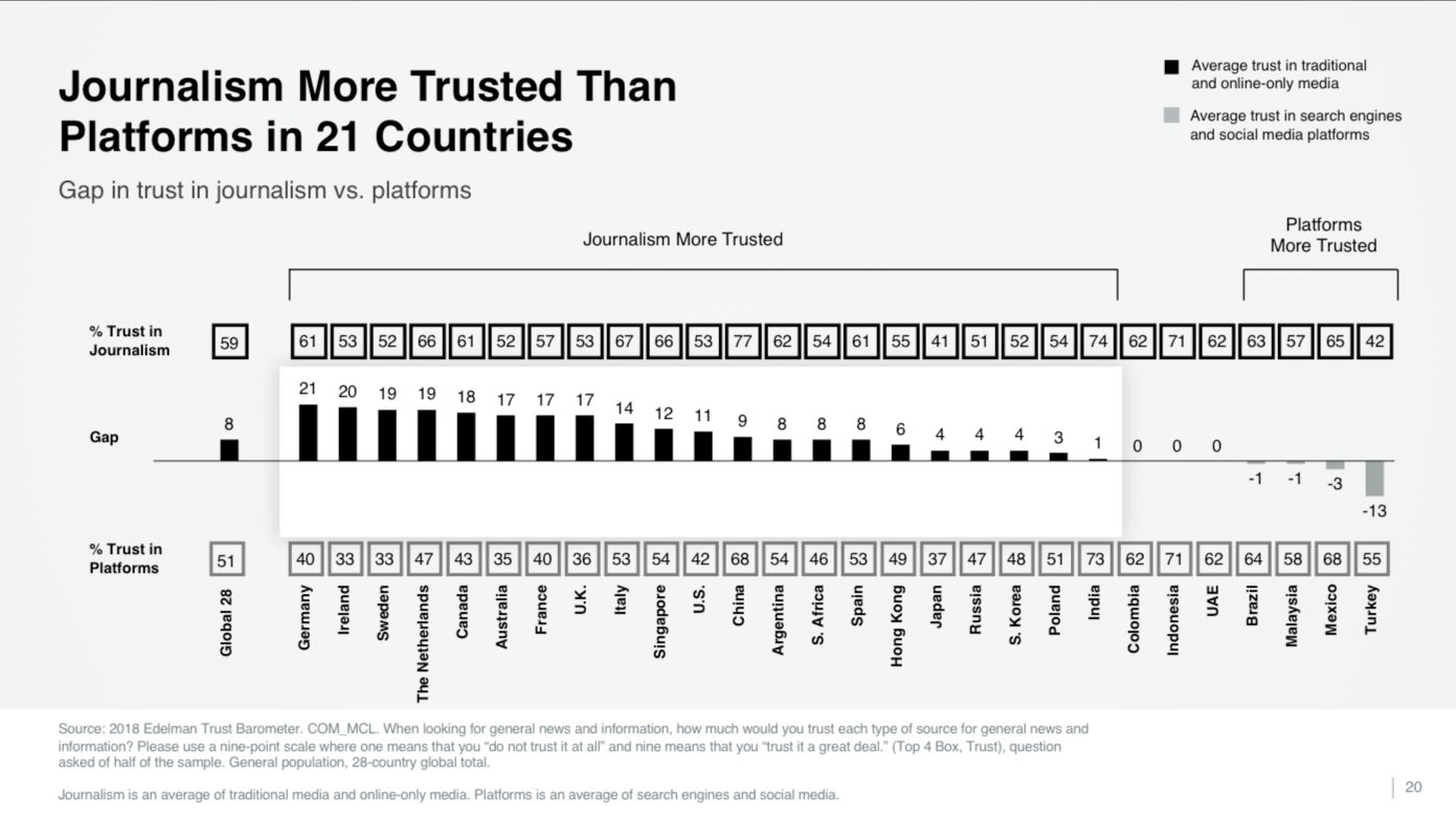 While both were pretty close in 2017, trust in platforms is now at 51%, while trust in journalism has reached 59%. In the survey of over 33,000 people in 28 countries, “journalism” was defined as “traditional and online-only media,” while “platforms” was defined as “search engines and social media platforms.”